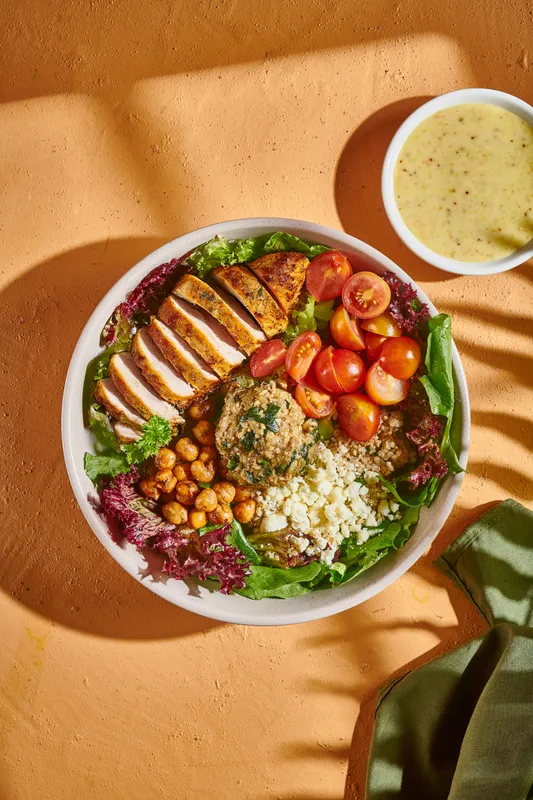 Ensalada a base de mix de lechugas y quinoa especiada acompañada de pollo a la plancha camote rostizado ligeramente picante manzana hummus y almendras fileteadas. Recomendada con vinagreta Balsámica.