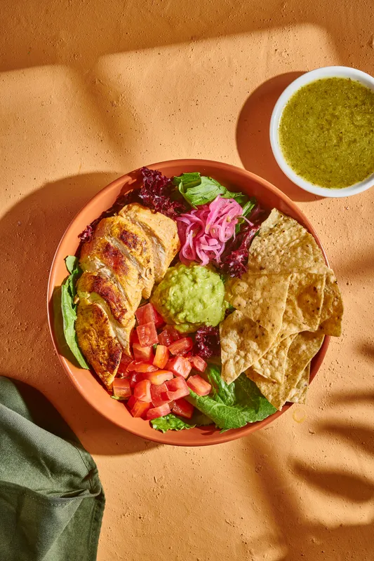 Ensalada a base de mix de lechugas acompañada de pollo a la plancha tomate chonto cebolla encurtida con trocitos de jalapeño totopos guacamole y cilantro. Recomendada con vinagreta de Jalapeños.