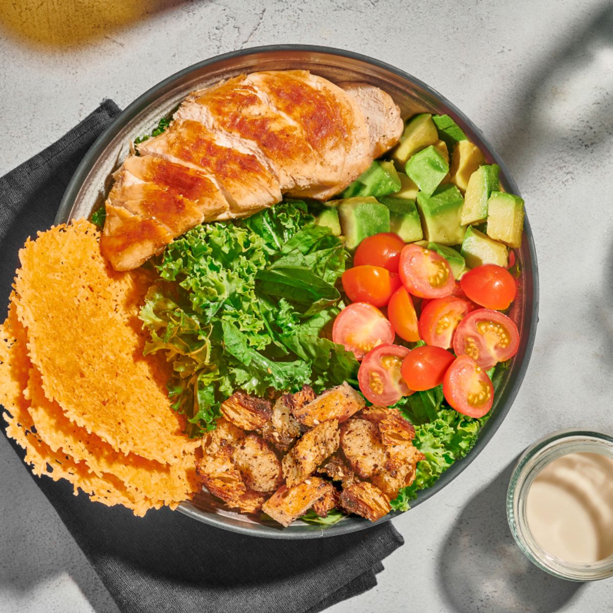 Ensalada a base de lechuga con pollo finas hierbas queso mozzarella pico de gallo aguacate totopos triturados y vinagreta a elección.